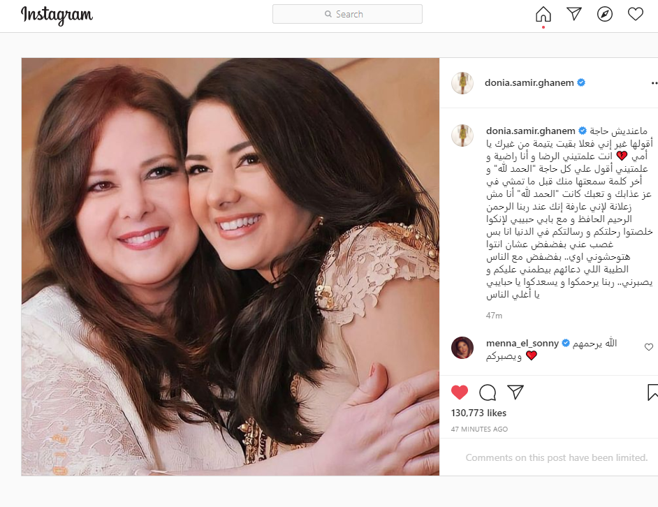 قالت دنيا سميرغانم فى أول تعليق لها، على وفاة والدتها دلال عبد العزيز، خلال صفحتها على موقع التواصل الاجتماعي "انستجرام": ( ماعنديش حاجة أقولها غير إني فعلا بقيت يتيمة من غيرك يا أمي 💔 انت علمتيني الرضا وأنا راضية وعلمتيني أقول علي كل حاجة "الحمد لله" وأخر كلمة سمعتها منك قبل ما تمشي في عز عذابك وتعبك كانت "الحمد لله" أنا مش زعلانة لإني عارفة إنك عند ربنا الرحمن الرحيم الحافظ ومع بابي حبيبي لإنكوا خلصتوا رحلتكم ورسالتكم في الدنيا انا بس غصب عني بفضفض عشان انتوا هتوحشوني أو ي.. بفضفض مع الناس الطيبة اللي دعائهم بيطمني عليكم ويصبرني.. ربنا يرحمكوا ويسعدكوا يا حبايبي يا أغلي الناس).
