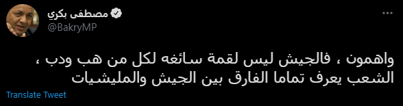 وأضاف عضو مجلس النواب، في تغريده له على موقع التواصل الاجتماعي «تويتر»: «واهمون، فالجيش ليس لقمة سائغة لكل من هب ودب.. الشعب يعرف تمامًا الفارق بين الجيش والميليشيات».