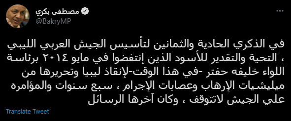 ووجّه عضو مجلس النواب، التحية للجيش الليبي في الذكري الحادية والثمانين لتأسيس الجيش العربي الليبي، قائلًا: “كل التحية والتقدير للأسود الذين انتفضوا في مايو 2014 برئاسة اللواء خليفه حفتر، لإنقاذ ليبيا وتحريرها من ميليشيات الإرهاب وعصابات الإجرام.. سبع سنوات والمؤامرة على الجيش لا تتوقف”.