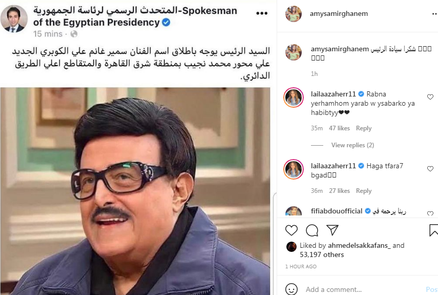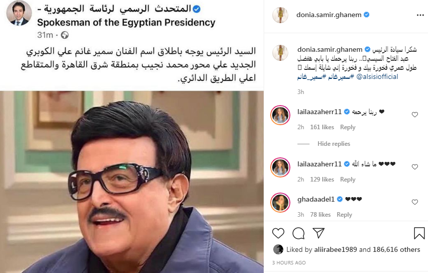 وأعادت الفنانة دنيا سمير غانم نشر قرارات السيسي، عبر حسابها الشخصي بموقع تبادل الصور والفيديوهات القصيرة انستجرام، قائلة: شكرًا سيادة الرئيس، معربة عن شكرها وامتنانها بهذه اللافتة، التي أسعدت الأسرة في وقت الحزن الكبير، الذي يمرون به في الوقت الحالي.