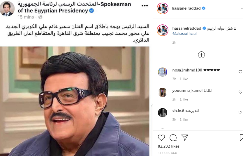 وأيضًا نشر زوجها الفنان حسن الرداد هذا الخبر، عبر حسابه الشخصي بموقع تبادل الصور والفيديوهات انستجرام، وعلق عليها قائلًا: شكرًا سيادة الرئيس.