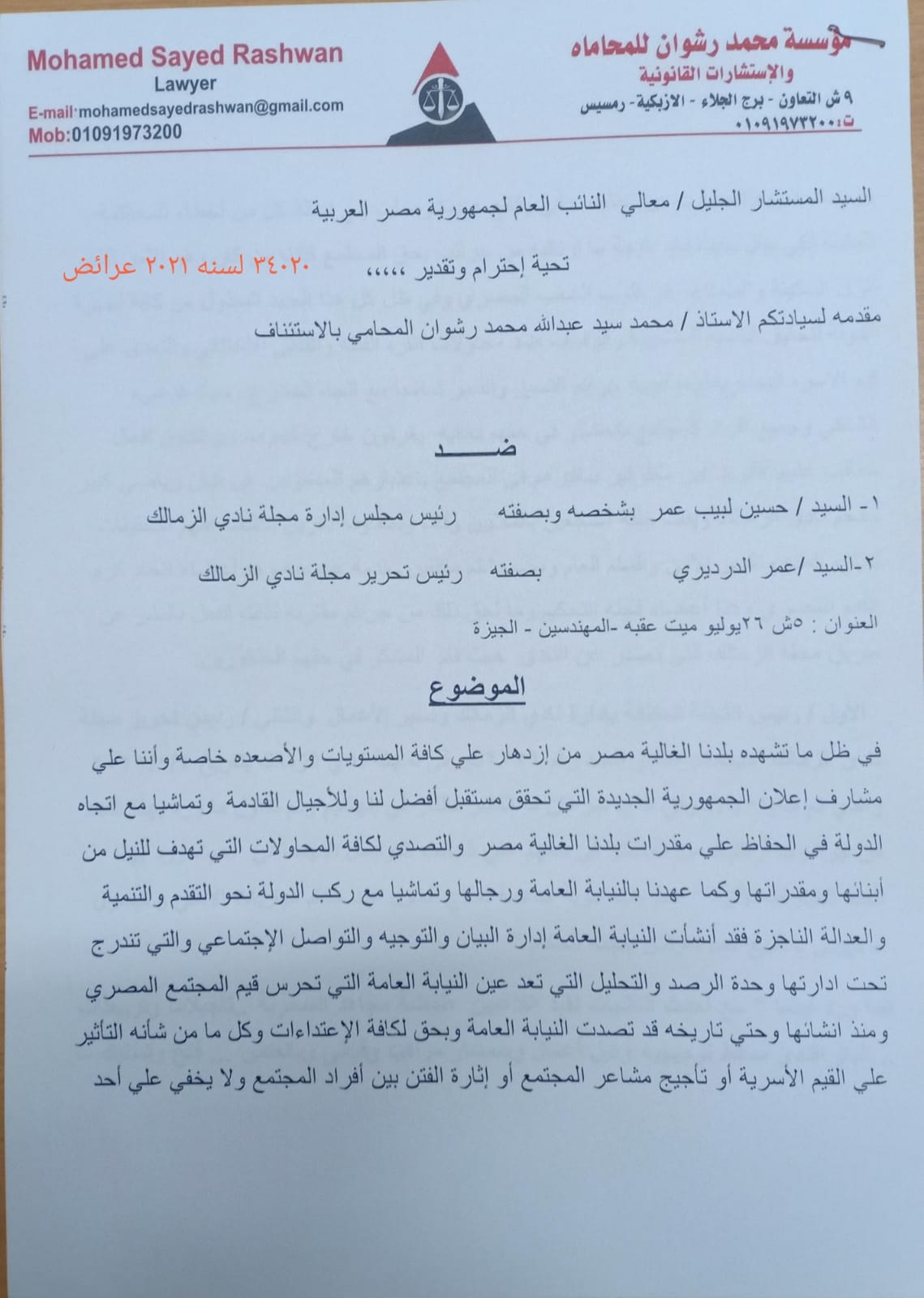 حمل البلاغ رقم 34020 لسنة 2021 عرائض النائب العام ضد حسن رئيس مجلس إدارة مجلة الزمالك وعمر الدرديري رئيس تحرير مجلة نادي الزمالك