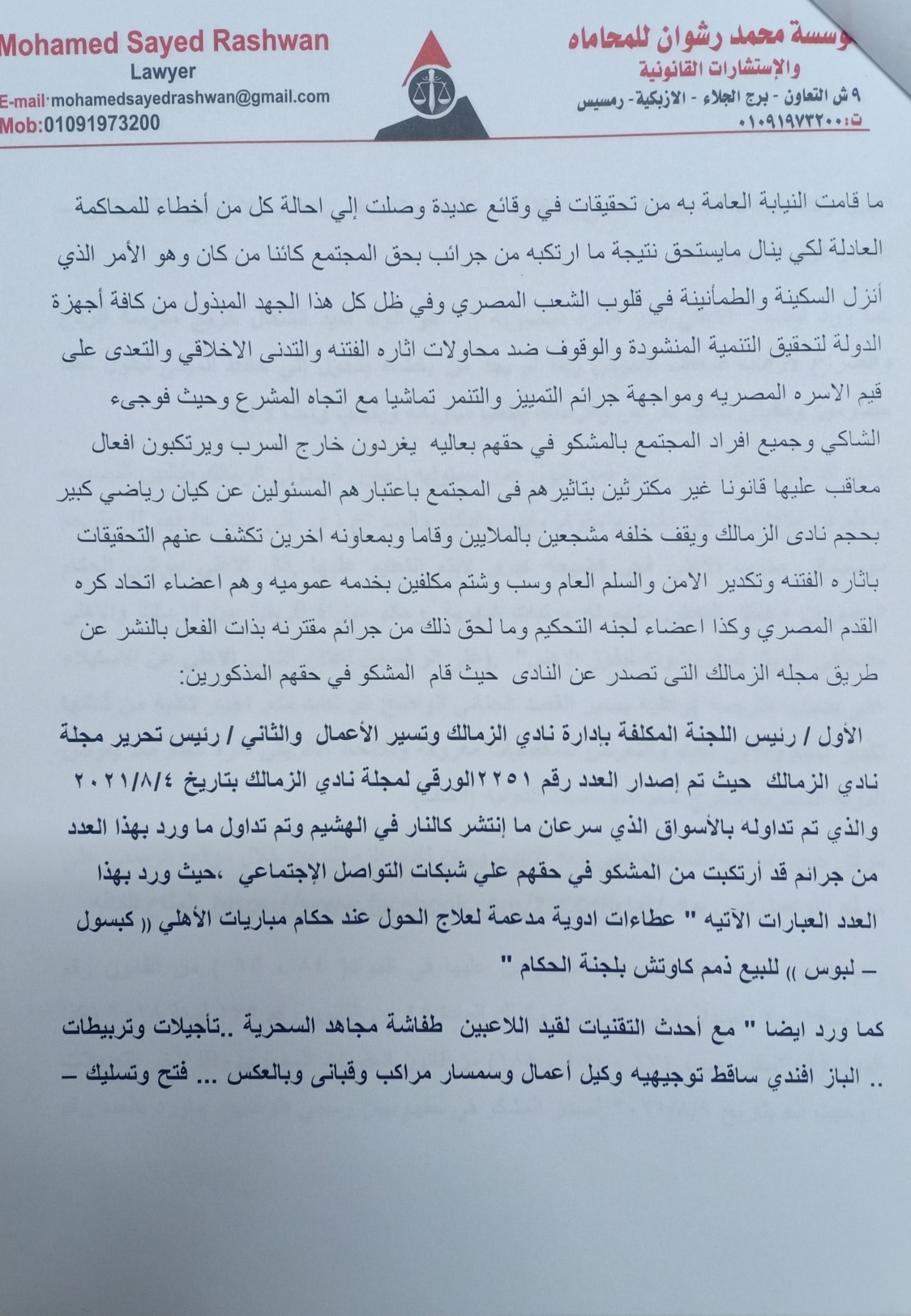 طالب رشوان بالتحقيق في البلاغ وما تضمنه العدد، حيث يشكل ما ورد في العدد – حسب البلاغ- جرائم منصوص عليها في المواد رقم 84 و93 من القانون رقم 71 لسنة 2017 بإصدار قانون الرياضة وكذلك المادة 25 من القانون رقم 175 لسنة 2018 والمواد 309 مكرر ب و171 و184 و188 من قانون العقوبات المصري وفقا لأخر تعديلات، إلى ذلك حيث قام فيه مجلس إدارة الزمالك برئاسة حسين لبيب، بمعاقبة المسؤول عن عدد المجلة، وفتح تحقيق فيما تم نشره، وإيقاف إصدار المجلة لمدة شهر لحين الانتهاء من تطوير وإعادة هيكلة المنظومة الإعلامية.