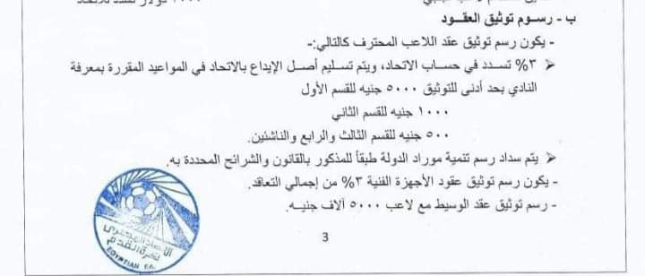 يكون رسم توثيق عقود الأجهزة الفنية 3% من إجمالي التعاقد، ورسم توثيق عقد الوسيط مع لاعب 5000 جنيه.