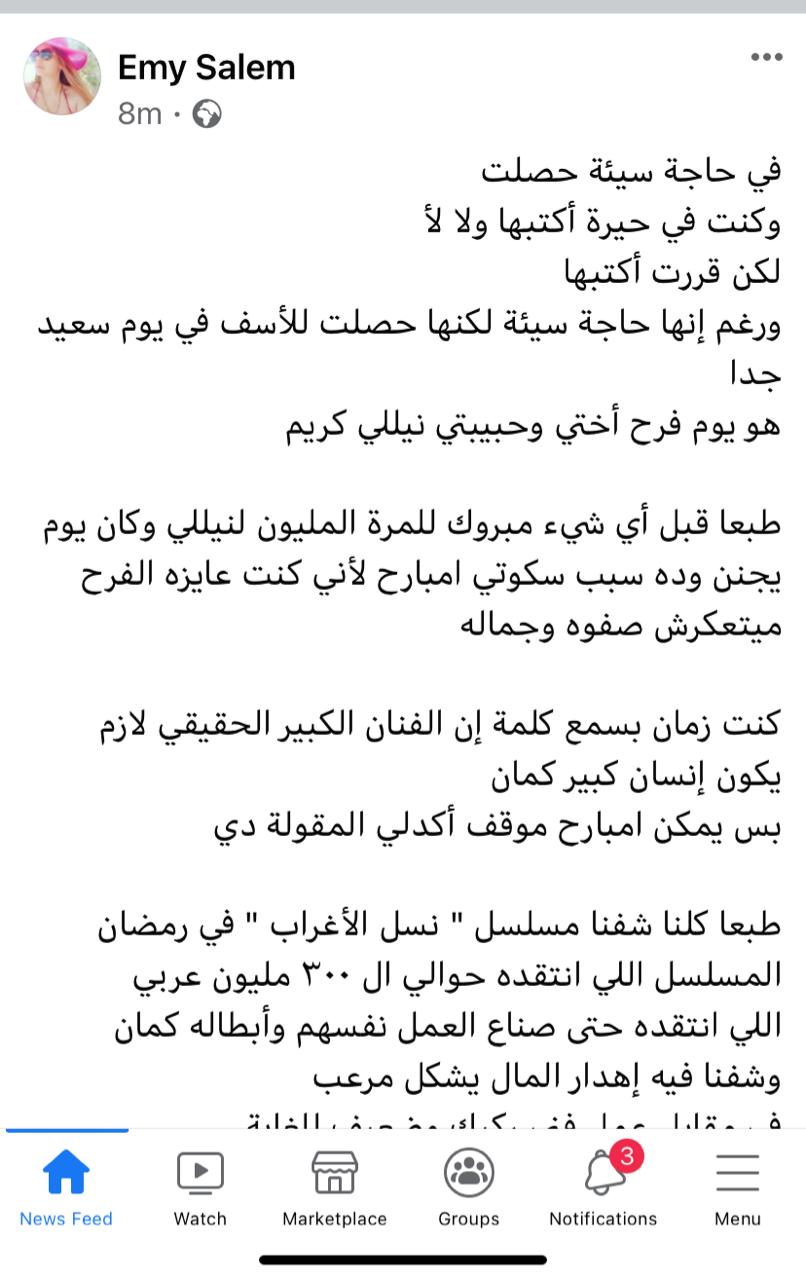 ونشرت إيمي عبر حسابها الشخصي بموقع التواصل الاجتماعي فيس بوك، قائلةً: فيه حاجة سيئة حصلت، وكنت في حيرة أكتبها ولا لأ، لكن قررت أكتبها، ورغم إنها حاجة سيئة لكنها حصلت للأسف في يوم سعيد جدا، هو يوم فرح أختي وحبيبتي نيللي كريم، طبعا قبل أي شيء مبروك للمرة المليون لنيللي وكان يوم يجنن وده سبب سكوتي امبارح، لأني كنت عايزة الفرح ميتعكرش صفوه وجماله.