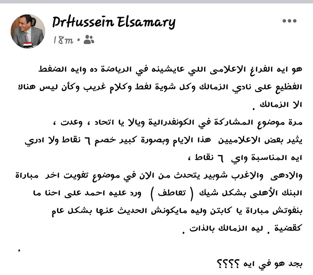 وكتب حسين السمري عبر صفحته على فيس بوك: «هو ايه الفراغ الإعلامي اللي عايشينه في الرياضة ده وايه الضغط الفظيع على نادي الزمالك وكل شوية لغط وكلام غريب وكأن ليس هناك إلا الزمالك».