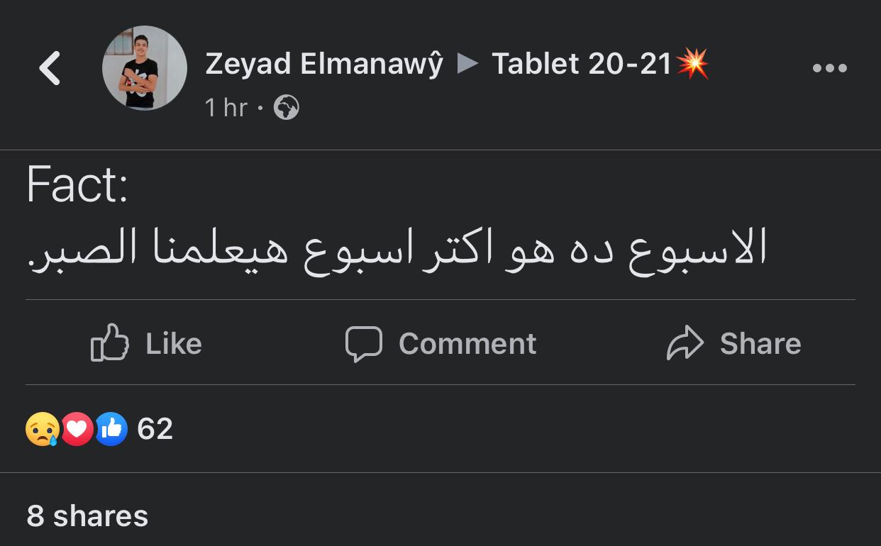 عبر زياد المنياوي، طالب الثانوية العامة، في جروب Tablet 20-21، قائلًا: الأسبوع دا أكتر أسبوع هيعلمنا الصبر.