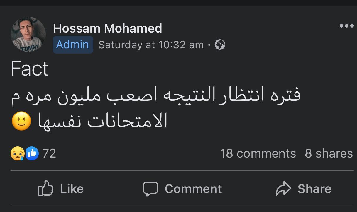 وكتب حسام محمد، طالب الثانوية العامة، إن فترة انتظار النتيجة أصعب مليون مرة من فترة الامتحانات نفسها، على حد وصفه.