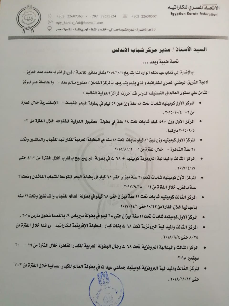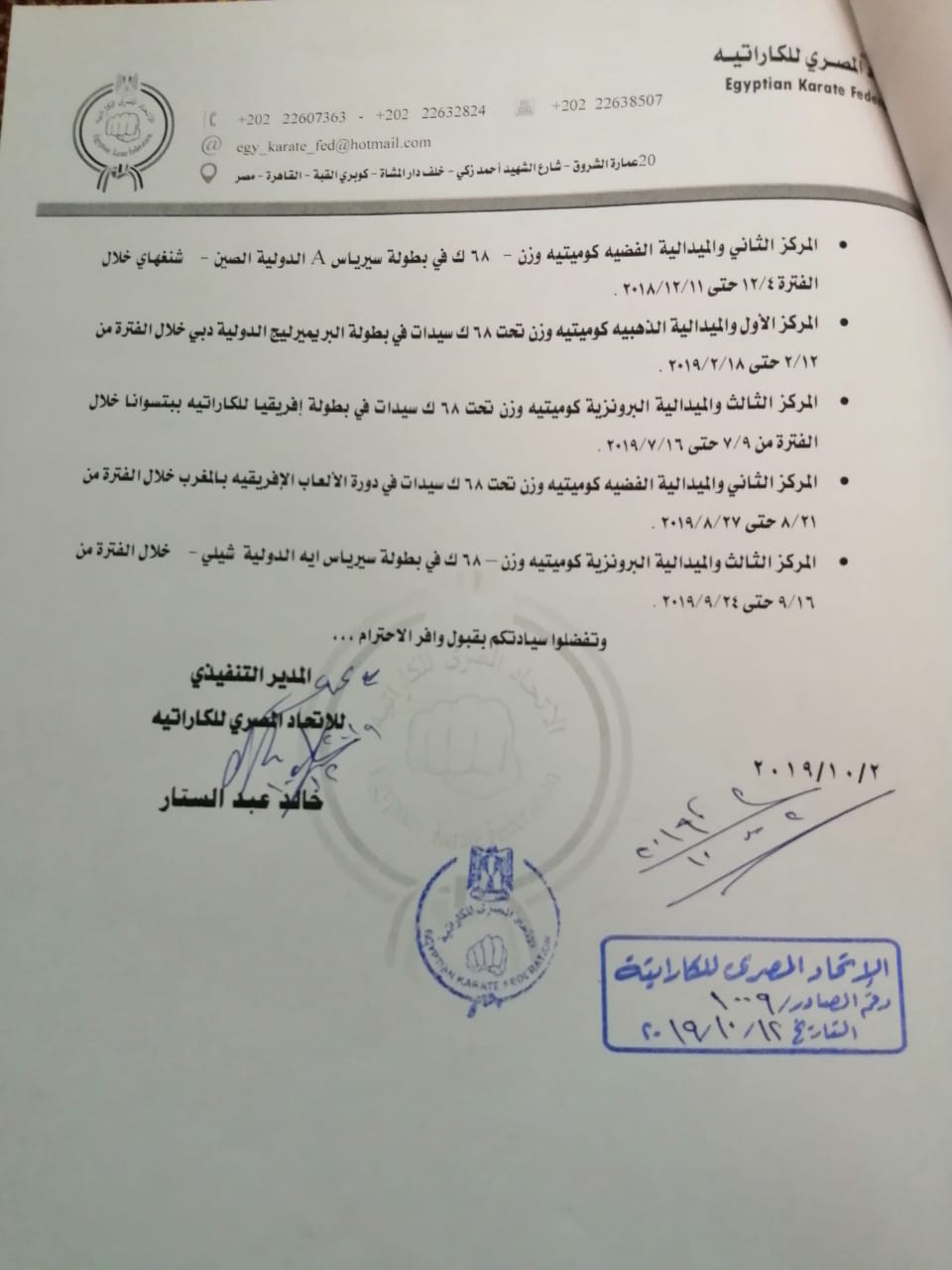 وتابع: كان يوجد دعم كبير جدًّا من الاتحاد المصري للكاراتيه، حيث أسهم في العديد من البطولات البريميرليج وأكثر من 20 بطولة أخرى، لكن كان يوجد بعض من البطولات على نفقه فريال الخاصه وأهلها.