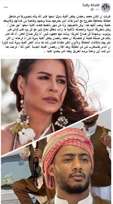 ونشرت سالي خليل عبر حسابها الشخصي «فيس بوك»: «عرفت إن الفنان محمد رمضان بيعمل أغنية بدوي اسمها على الله وصورها في مناطق مختلفة بمحافظة مطروح مع البدو هناك اللي بحترمهم بشدة وبحبهم وخاصة بإن عاداتهم وتقاليدهم جميلة وبحب أكلهم جدًا، وكل تفاصيلهم، وأنا من شهر بالظبط عملت أغنية اسمها «تهز جبال»، وهي بالطريقة البدوية والحمدلله الأغنية ما زالت بتحقق نجاح كبير مع كل يوم علي قناتي عبر يوتيوب، وبشهادة كل صناع المزيكا، وبذلت فيها مجهود كبير، أنا وكل صناع العمل».