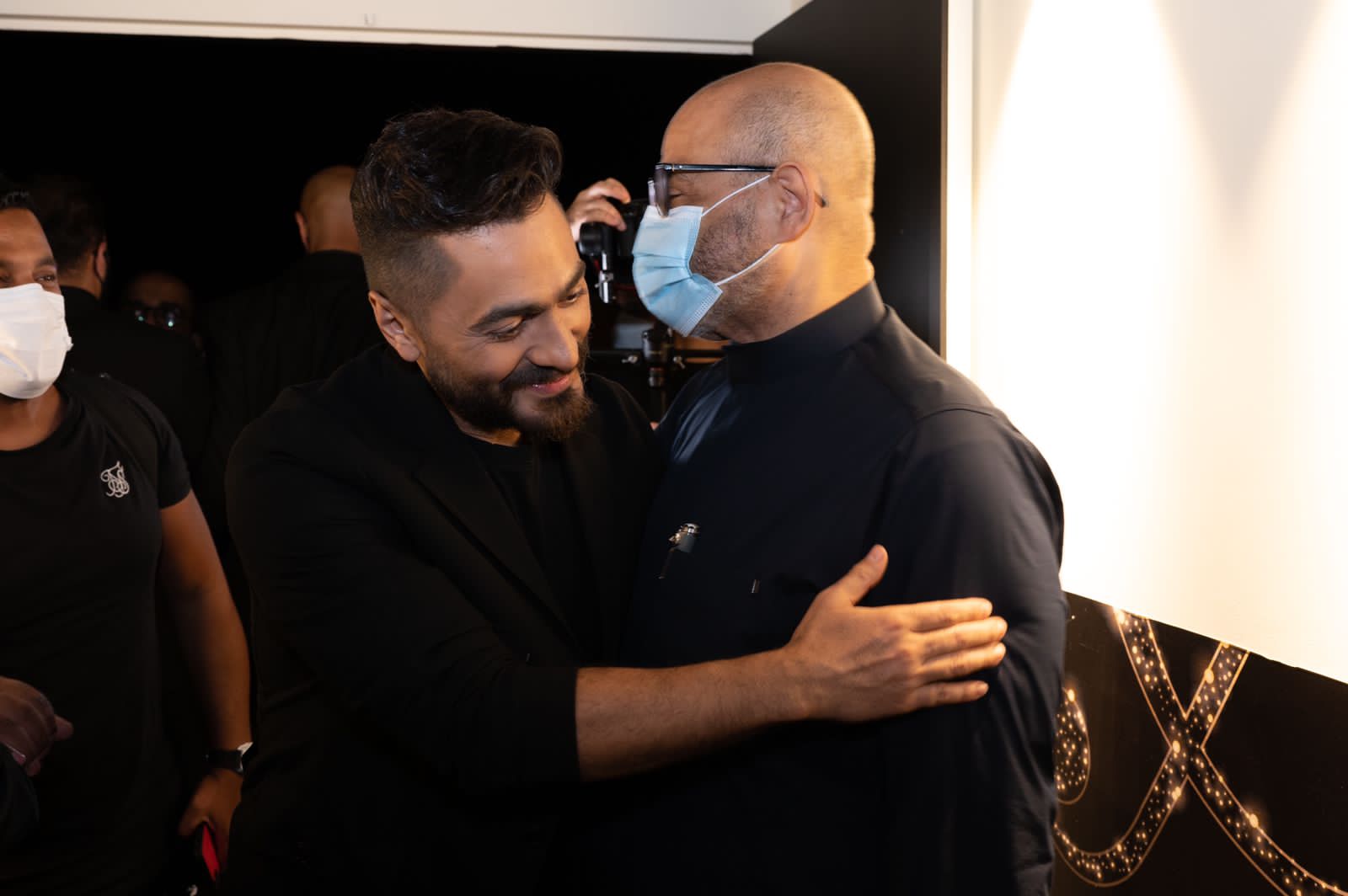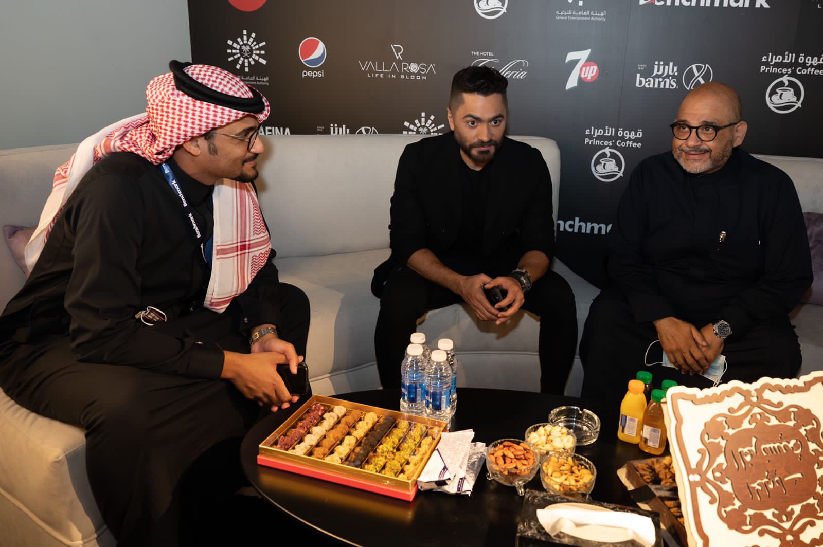 وفور ظهور تامر حسني حرص على توجيه التحية إلى المستشار تركي آل الشيخ وللمنتج محمد حسنين المدير التنفيذي لشركة بنش مارك المنظمة للحفل، كما وجه التحية لجمهور جده على الاستقبال الرائع وقال إنه يشعر وكأنه في منزله وان هذا الاستقبال ليس جديدا على أهل جده.