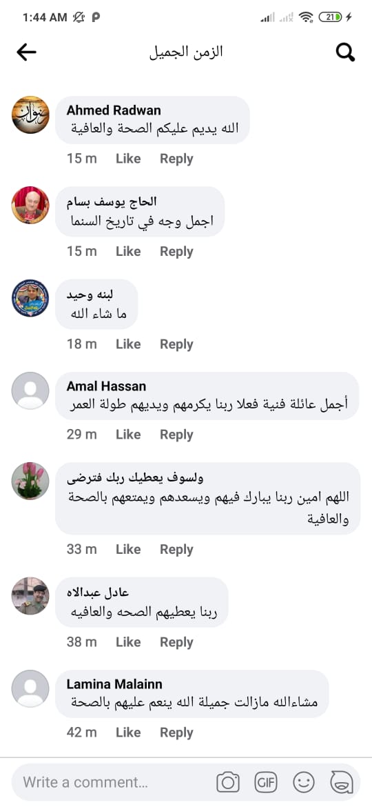 ليشهد المنشور العديد من التعليقات المُحبة لـ نسرين، الداعين لها ولأسرتها بالخير وجمال الوجه، فمنهم من قال: “أجمل وجه في تاريخ السينما”، “أجمل عائلة فنية فعلًا ربنا يكرمهم ويديهم طول العمر”، “الله يديم عليكم الصحة والعافية”، “ما شاء الله مازالت جميلة الله ينعم عليهم بالصحة”.