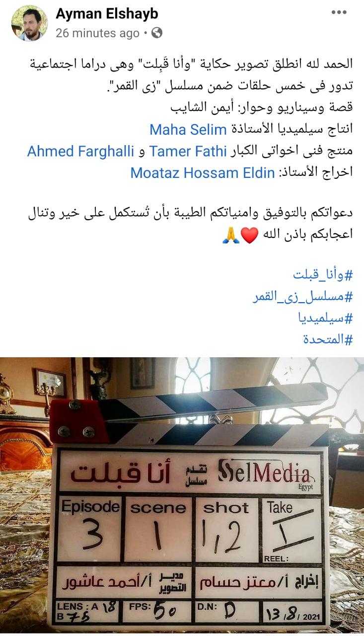 وكتب أيمن الشايب عبر حسابه الشخصي على موقع التواصل الاجتماعي فيسبوك: “الحمد لله انطلق تصوير حكاية وأنا قَبِلت وهي دراما اجتماعية تدور في خمس حلقات ضمن مسلسل زي القمر، قصة وسيناريو وحوار أيمن الشايب، إنتاج شركة سيلميديا للأستاذة مها سليم، منتج فني أخواتي الكبار تامر فتحي وأحمد فرغلي، وإخراج الأستاذ معتز حسام الدين، دعواتكم بالتوفيق وأمنياتكم بأن تُستكمل على خير وتنال إعجابكم بإذن الله”.
