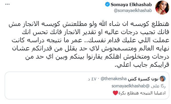 وتابعت سمية الخشاب تغريدتها قائلةً: «عمر ما نتيجة دراسة، كانت نهايه العالم، ومتسمحوش لأي حد يقلل من قدراتكم، عشان درجات ومتخلوش أهلكم يقارنوا بينكم وبين أي حد من قرايبكم جايب أعلى».