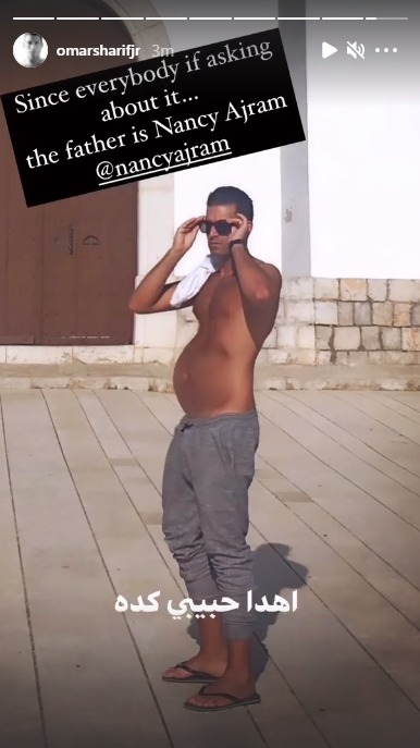 وتداول على السوشيال ميديا تعليقًا على فكرة حمله أنه بما تم عكس الأوضاع وأصبح الرجل هو الذي يحمل وليست المرأة فسيكون والد ذلك الطفل الذي حمل به هي الفنانة نانسي عجرم، ليعلق حفيد عمر الشريف على تلك المزحة قائلًا: “اهدا كده حبيبي”.