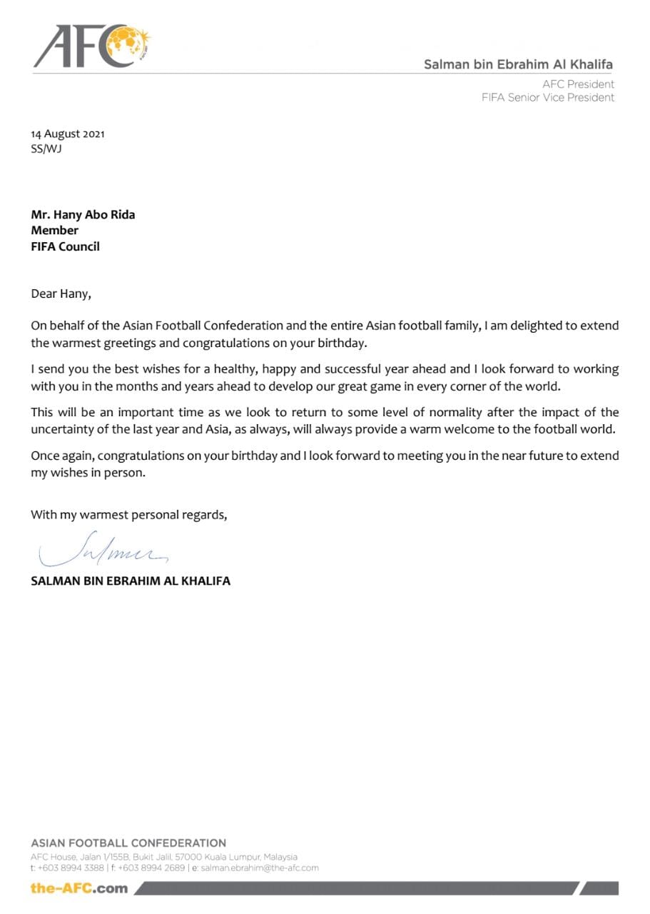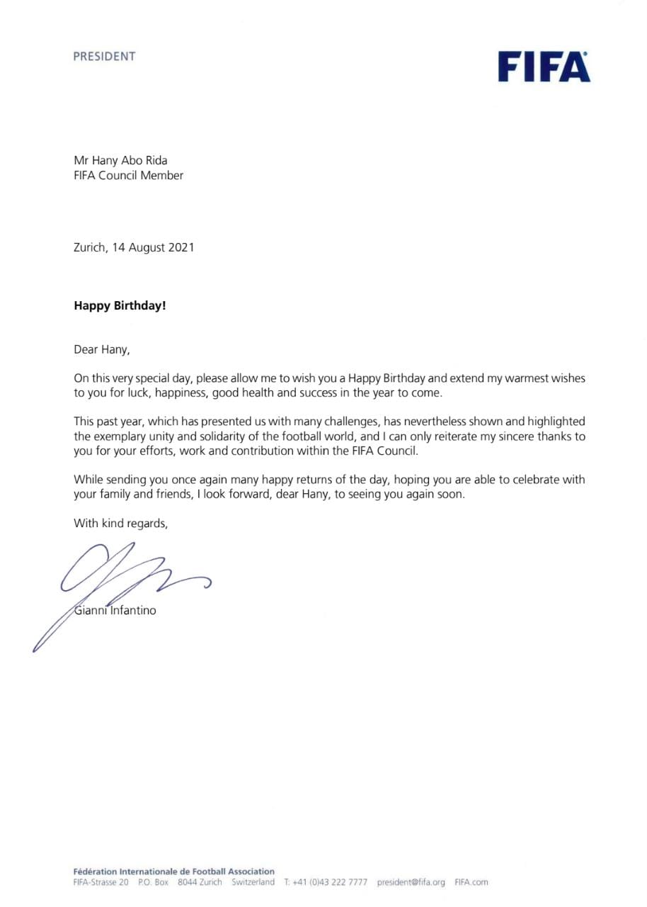وأرسل إنفانتينو خطاب تهنئة لأبوريدة، ذكر فيه: في هذا اليوم الخاص أتمنى لك عيد ميلاد سعيدًا، وأشكرك على جهودك الكبيرة في مجلس فيفا، التي ساعدتنا على تخطي الأوقات العصيبة بالمرحلة الماضية التي شهدت أوقاتًا عصيبة.