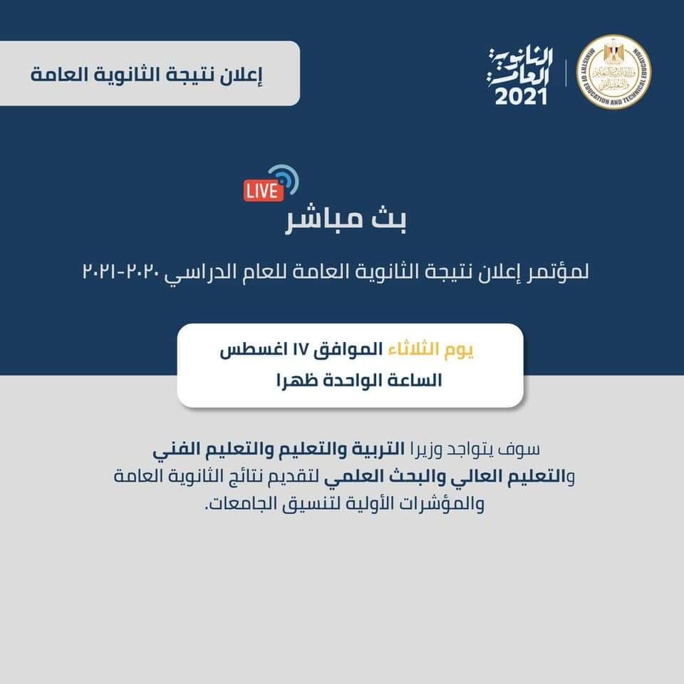 أعلن الدكتور طارق شوقي، وزير التربية والتعليم والتعليم الفني، عن موعد نتيجة الثانوية العامة رسميًا، وذلك يوم الثلاثاء المقبل الموافق 17-8-2021، عقب المؤتمر الصحفي المقرر انعقاده، لعرض نتيجة الثانوية العامة 2021 والمؤشرات الأولية لتنسيق الجامعات، لتكون متاحة على المواقع الإخبارية بالمجموع الكلي فقط، وتتاح على رابط وزارة التربية والتعليم بتفاصيل الدرجات.