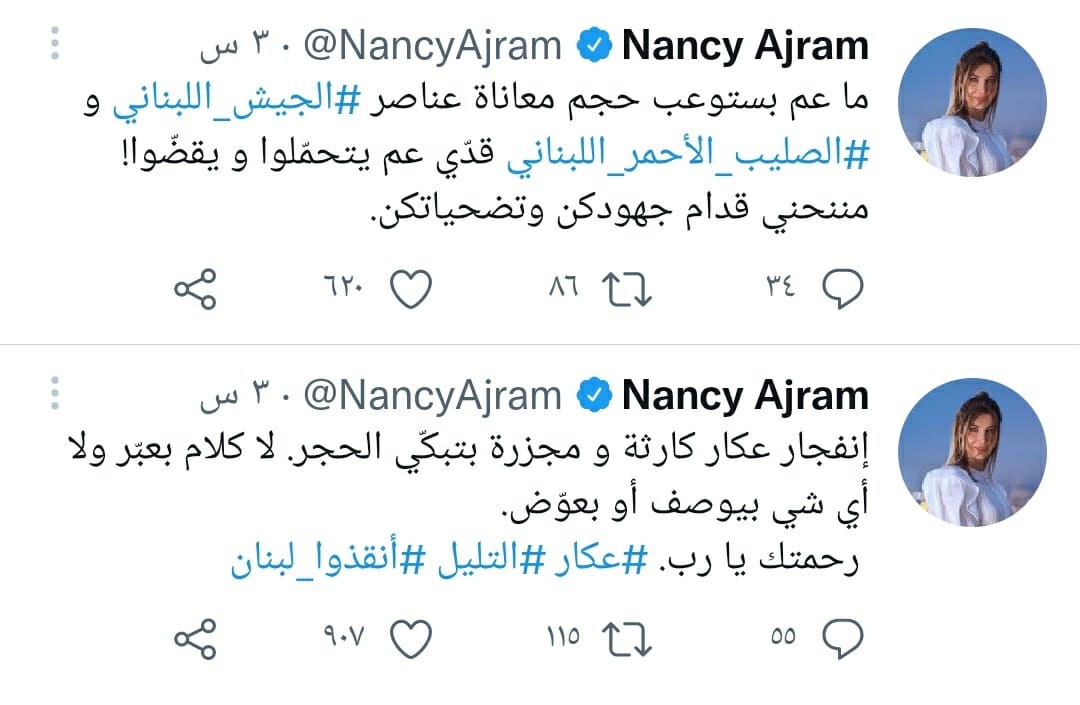 وكتبت الفنانة اللبنانية نانسي عجرم، تغريدة عبر حسابها الشخصي بموقع التدوينات القصيرة تويتر، قائلة: «انفجار عكار كارثة ومجزرة بتبكّي الحجر. لا كلام بعبّر ولا أي شي بيوصف أو بعوّض رحمتك يا رب.. انقذوا لبنان».