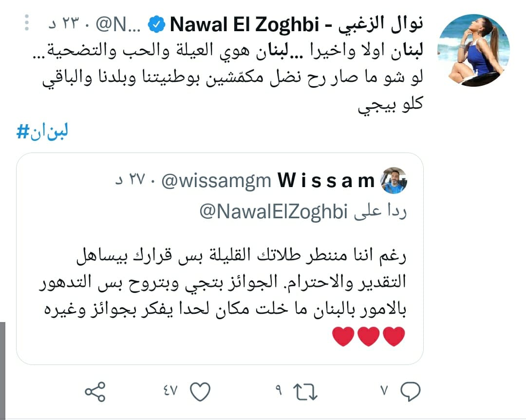 وبكلمات حادة أعربت الفنانة نوال الزغبي نجوى كرم عن غضبها، لما يمر به لبنان، وكتبت تغريدة، عبر حسابها على تويتر، تقول فيها: «الله يلعن كل زعيم وكل مسؤول بلبنان. يا بلا ضمير ووجدان، الله يرحم الضحايا اللي ماتوا اليوم، وكل يوم كرمال إنتوا تكونوا عالكراسي.. عكار».