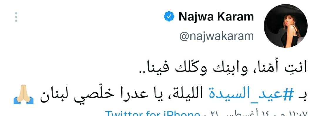 وعلقت الفنانة نجوى كرم، على حادث عكار في لبنان، عبر حسابه الشخصي على موقع التدوينات القصيرة تويتر، مغردةً: أنتِ أمّنا، وابنِك وكّلك فينا.. بـ عيد السيدة الليلة، يا عدرا خلّصي لبنان».
