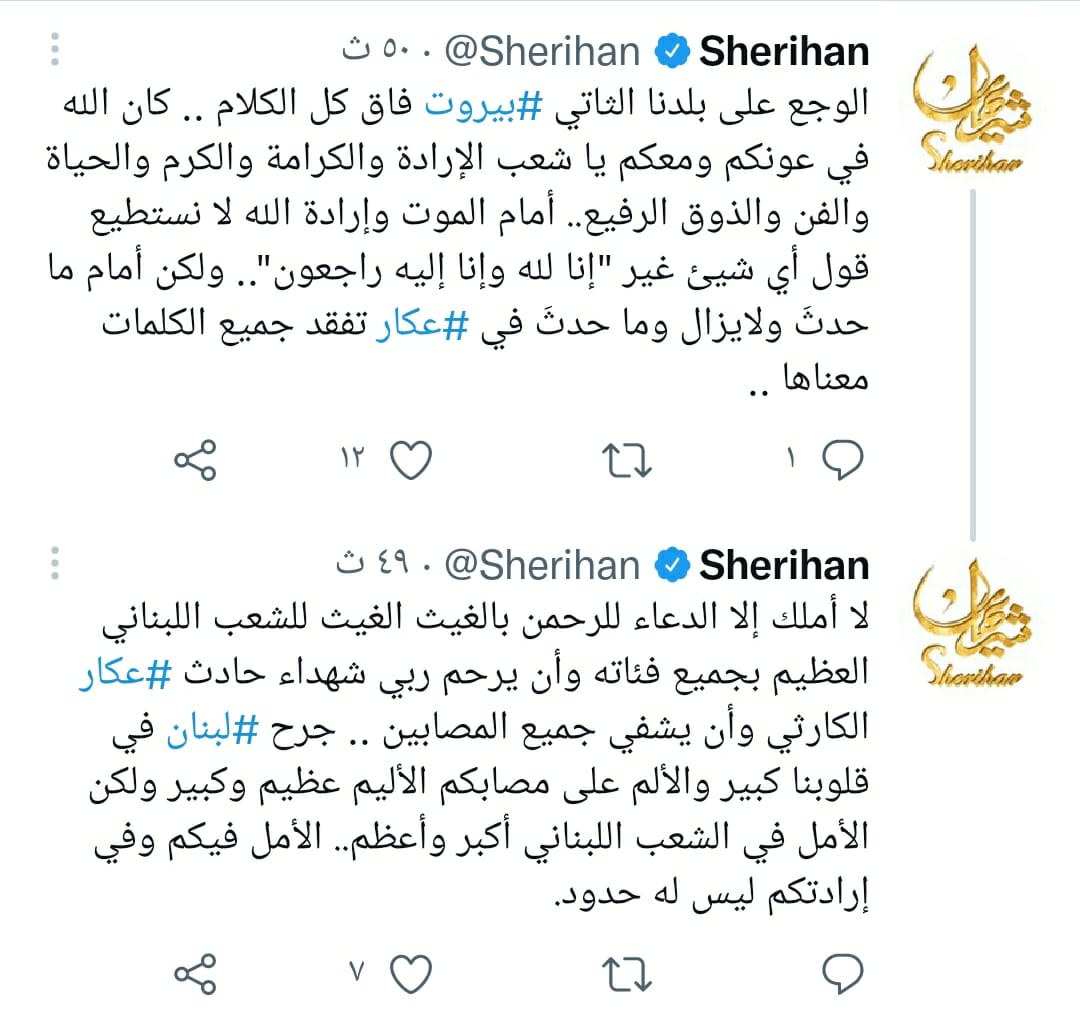 وكتبت شريهان تغريدة تواسي فيها الشعب اللبناني، عبر حسابها الشخصي بموقع التغريدات القصيرة تويتر، قائلة: وجع على بلدنا الثاني بيروت فاق كل الكلام.. كان الله في عونكم ومعكم، يا شعب الإرادة والكرامة والكرم، والحياة والفن والذوق الرفيع أمام الموت وإرادة الله لا نستطيع قول أي شيء غير إنا لله وإنا إليه راجعون. ولكن أمام ما حدثَ ولايزال، وما حدثَ في عكار تفقد جميع الكلمات معناها.
