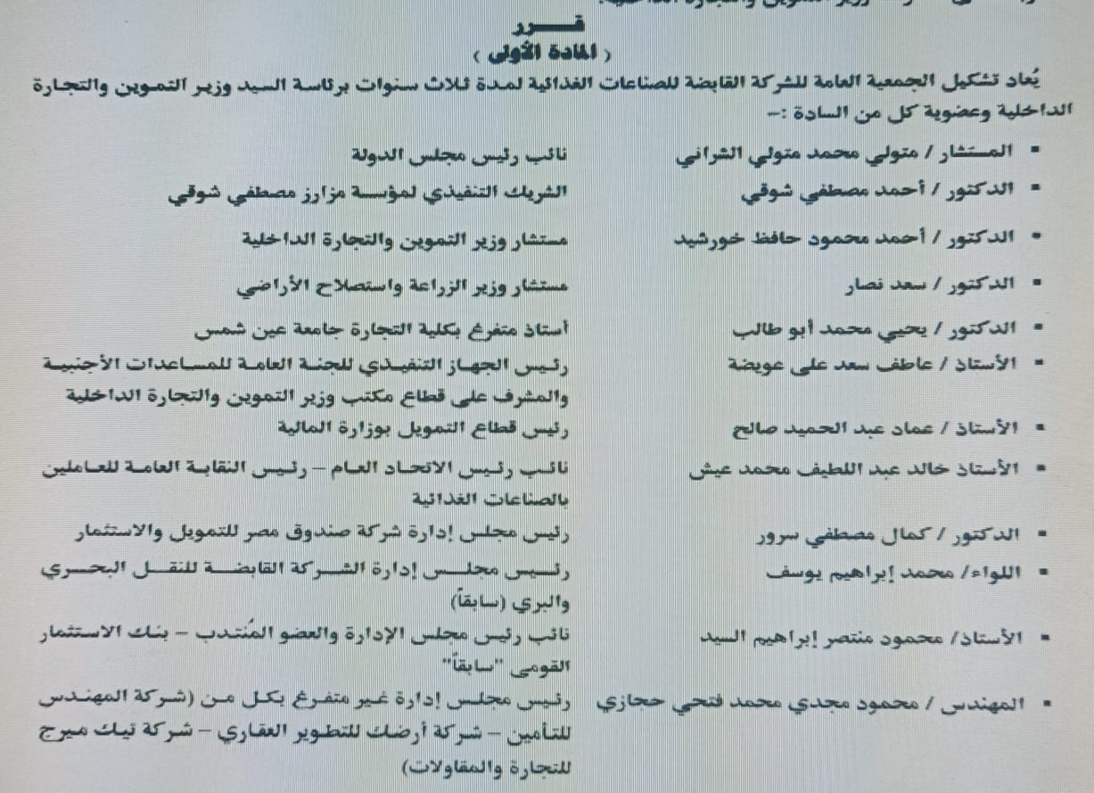 برئاسة وزير التموين.. ننفرد بنشر تشكيل الجمعية العامة للشركة القابضة للصناعات الغذائية بعد قرار إعادة تشكيلها