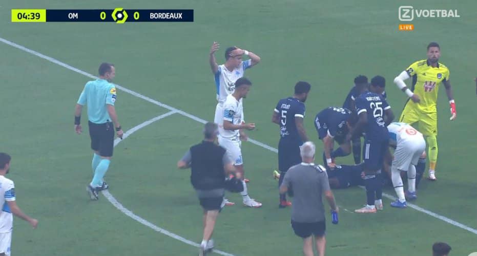 حدثت حالة إغماء وسقوط على أرضية الملعب بعد بداية مباراة فريق أولمبيك مرسيليا وفريق بوردو في الدوري الفرنسي الممتاز.