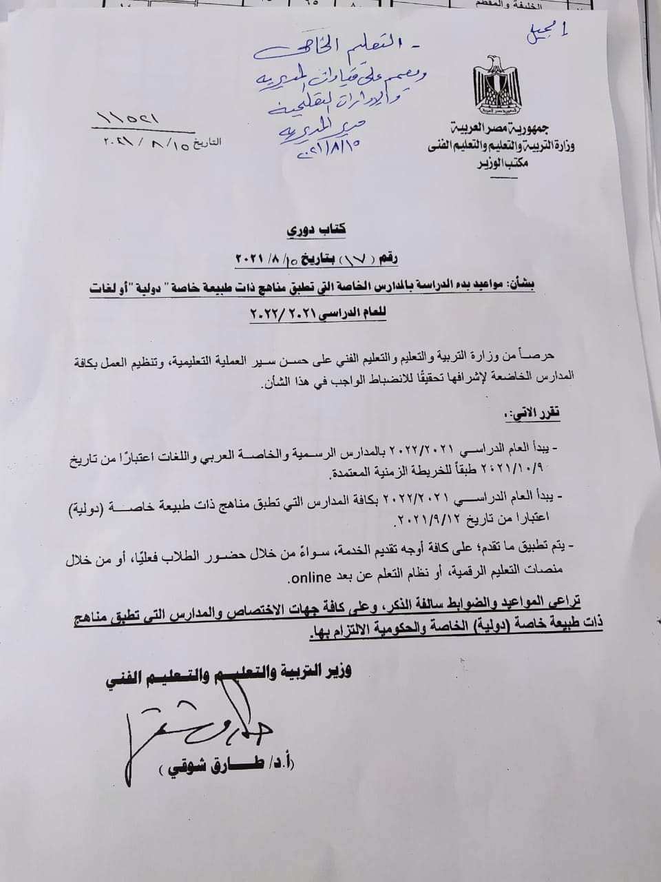 كما يبدأ العام الدراسي بكافة المدارس التي تطبق مناهج ذات طبيعة خاصة دولية اعتبارا من تاريخ 12 سبتمبر، ويتم تطبيق ما تقدم؛ على كافة أوجه تقديم الخدمة، سواء من خلال حضور الطلاب فعليا، أو من خلال منصات التعليم الرقمية، أو نظام التعلم عن بعد online.