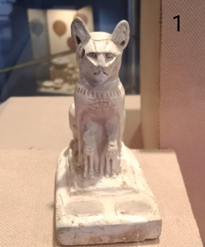 1- تمثال لقطه تمثل المعبودة باستت المعبودة الرسمية في منطقه تل بسطه بمحافظة الشرقية، ومصنوعة من القيشاني، ويصل ارتفاعها إلى نحو 8.3 سم.