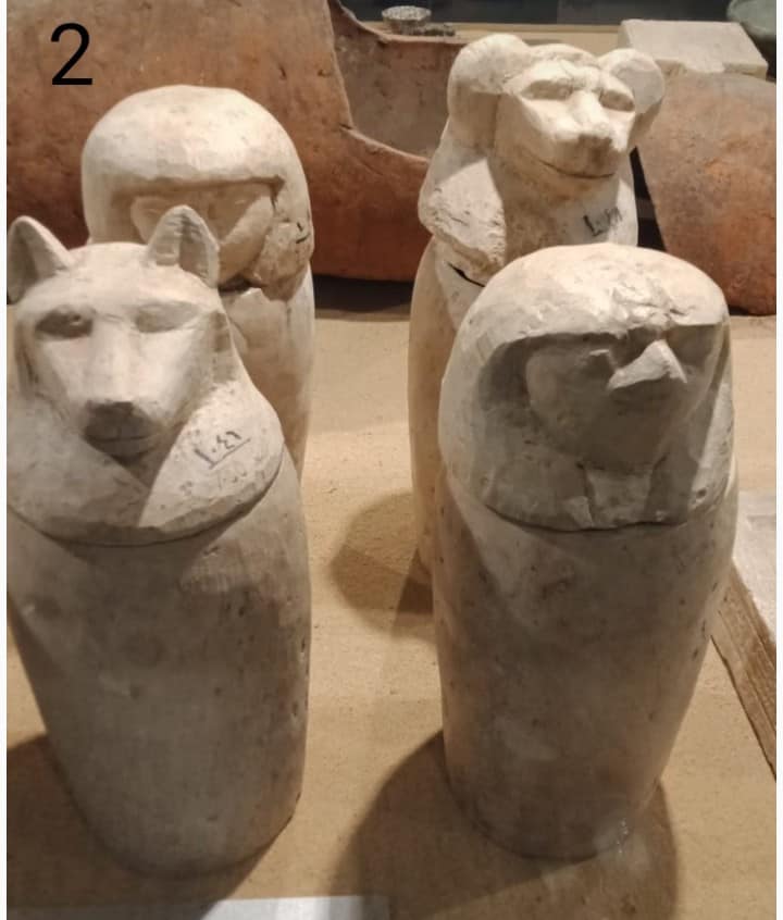 2-مجموعه من الأواني الكانوبيه مصنوعة من المرمر، وكانت تستخدم لحفظ أحشاء المتوفي أثناء عمليه التحنيط، وتُعرف باسم أبناء حورس الأربعة.