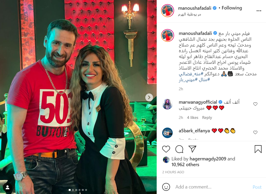 ونشرت منة فضالي، الصور عبر حسابها الشخصي بموقع تبادل الصور والفيديوهات انستجرام، وعلقت قائلة: فيلم ميني بار مع الناس الحلوة بحبهم بجد نضال الشافعي ومدحت تيخة وعم الناس كلهم عم صلاح عبدالله.. فنانين كثير.. أمينه العسل راندا البحيري حسام عبد الفتاح طاهر أبو ليلة شيماء يونس، إخراج الأستاذ عادل الأعصر ومحمد الخضر، إنتاج الأستاذ مدحت سعد.. دعواتكم.