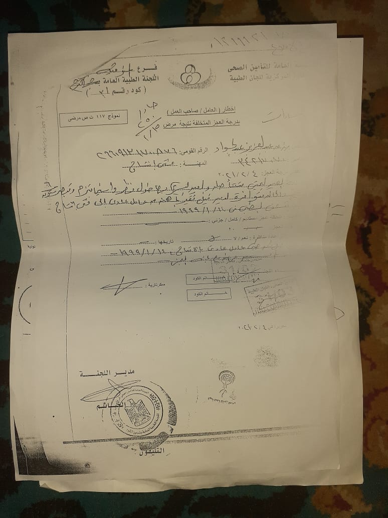 وتابع «تم عرضي على لجنة أولى وثانية في شبين الكوم، وتعرضت للتعنت والظلم ولم تعط اللجنة ورقة تثبت نسبة العجز، لكي أحصل على معاشي نظرًا لظروفي المرضية».