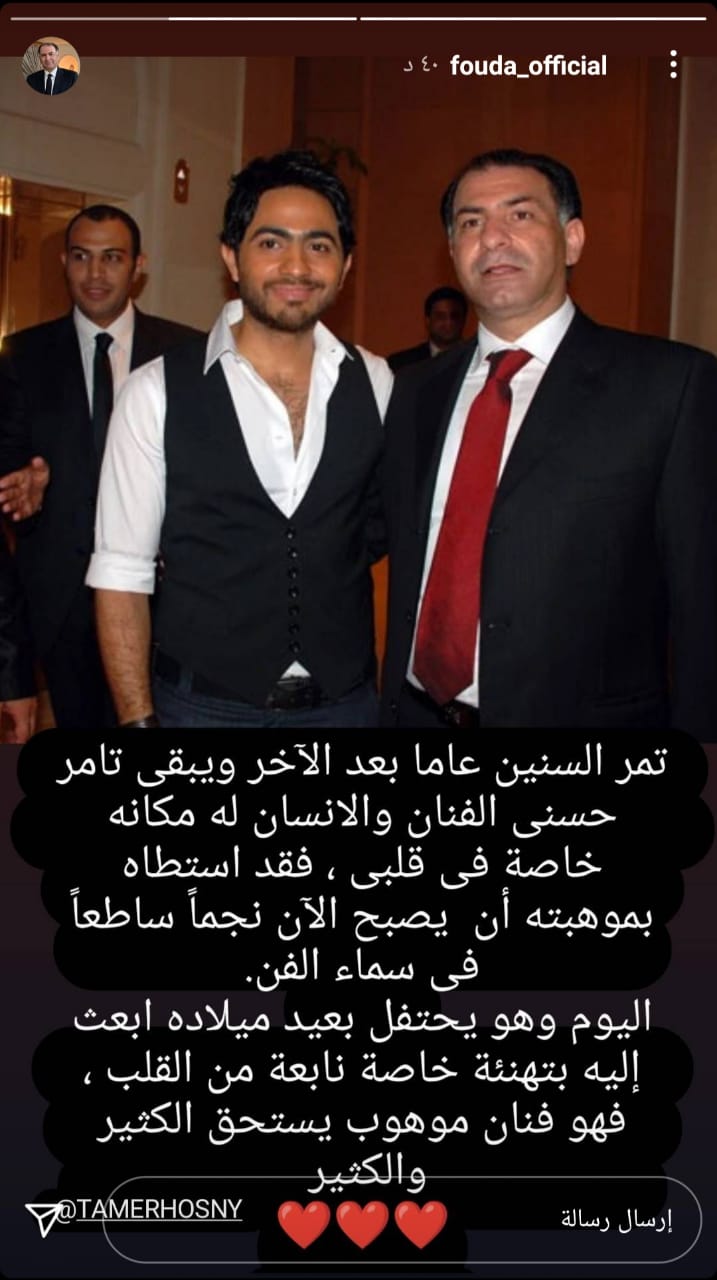 هنأ الإعلامي والكاتب محمد فودة، أسطورة مصر تامر حسني، بعيد ميلاده، حيث حرص الإعلامي على نشر تهنئة خاصة له عبر خاصية الاستوري على صفحته الرسمية بموقع انستجرام.