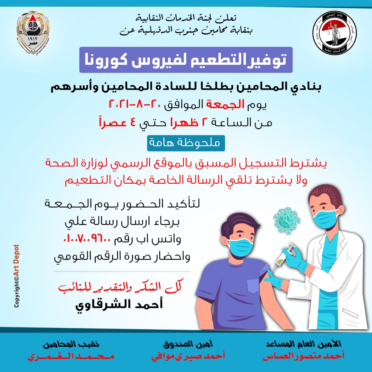 أعلنت لجنة الخدمات النقابية بنقابة المحامين بجنوب الدقهلية توفير التطعيم الخاص بفيروس كورونا للمحامين وأسرهم، وذلك يوم الجمعة الموافق 20 أغسطس، بنادي المحامين بطلخا.