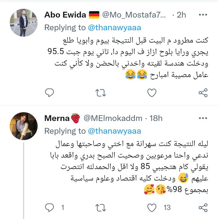 ويحكي الطلاب لحظات معرفتهم النتيجة، فعلقت خلود على تويتة بعنوان “احكيلنا ذكرياتك مع نتيجة الثانوية العامة”، “معرفتش انام طول الليل وقلقانه لحد الصبح وماما زغرطت من الفرحه مع اني كنت جايبه 65% وكلهم فرحولي لمجرد اني عديت من السنه صافي”، وجاء رد حسن مصطفى مطمئنا الطلاب “لما جبت النتيجة مجموعي مكنش حلو 93% ودخلت آداب والحمد لله علي اختيار الله”.