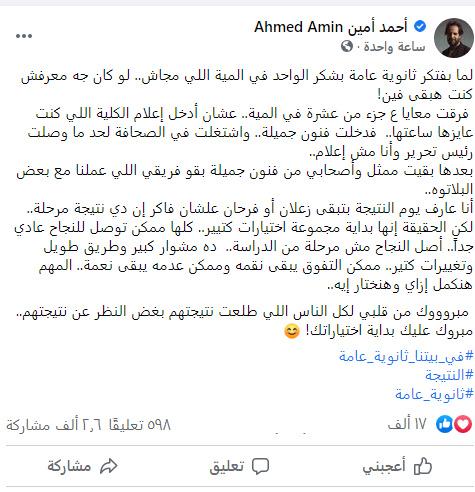 وأكد أن النجاح ليس مرحلة من الدراسة بل أنه مشوار كبير وطريق طويل وتغييرات كثيرة وأن التفوق من الممكن أن يكون نقمة وعدمه نعمة، مضيفًا: المهم هنكمل إزاي وهنختار إيه.. مبروووك من قلبي لكل الناس اللي طلعت نتيجتهم بغض النظر عن نتيجتهم.. مبروك عليك بداية اختياراتك!.