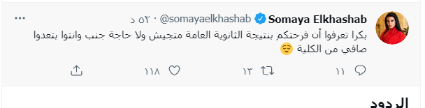 كما وجهت الفنانة سمية الخشاب رسالة لـ طلاب الثانوية العامة، من خلال تدوينة عبر حسابها عبر بموقع التدوينات القصيرة تويتر، إذ كتبت: “بكرا تعرفوا أن فرحتكم بنتيجة الثانوية العامة متجيش ولا حاجة جنب وانتوا بتعدوا صافي من الكلية وجه مرتاح”.