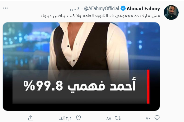 فيما شارك الفنان أحمد فهمي جمهوره، نتيجته في الثانوية العامة، ونشر تدوينة ممازحًا فيها جمهور عبر موقع تويتر، ظهر فيها مجموعة وهو 99.8%، معلقًا: “مش عارف ده مجموعي ف الثانوية العامة ولا كنت بنافس ديتول”.