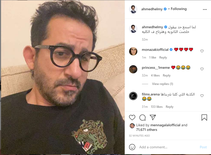 أما الفنان أحمد حلمي فنشر صورة له عبر حسابه بموقع انتسجرام وعلق عليها ساخرًا: “لما اسمع حد بيقول خلصت الثانويه وهترتاح في الكلية”.