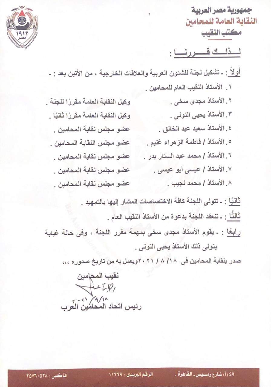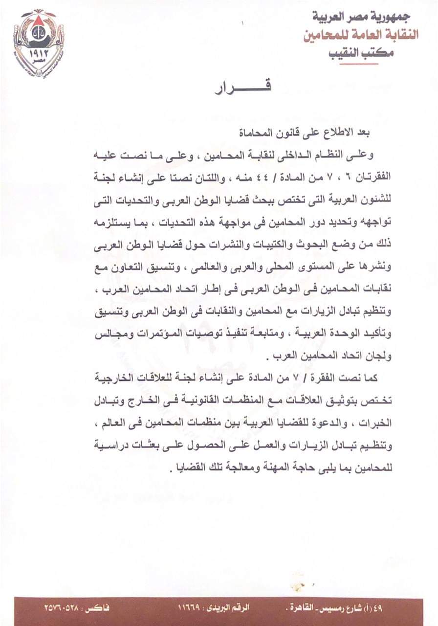 بعد الاطلاع على قانون المحاماة وعلى النظام الداخلى لنقابة المحامين، وعلى ما نصت عليه الفقرتان 6، 7 من المادة/44 منه، واللتان نصتا على إنشاء لجنة للشئون العربية التى تختص ببحث قضايا الوطن العربي والتحديات التى تواجهه وتحديد دور المحامين فى مواجهة هذه التحديات، بما يستلزمه ذلك من وضع البحوث والكتيبات والنشرات حول قضايا الوطن العربى ونشرها على المستويات المحلية والعربية والعالمية، وتنسيق التعاون مع نقابات المحامين في الوطن العربي في إطار اتحاد المحامين العرب، وتنظيم تبادل الزيارات مع المحامين والنقابات في الوطن العربى وتنسيق وتأكيد الوحدة العربية، ومتابعة تنفيذ توصيات المؤتمرات ومجالس ولجان اتحاد المحامين العرب.