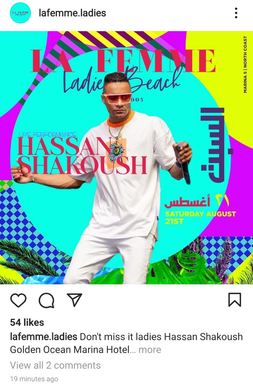 أعلن مؤدي المهرجانات حسن شاكوش، أنه يستعد هو الأخير لإحياء حفل غنائي في الساحل الشمالي، في أحد الشواطئ هناك، والحفل سيكون للسيدات فقط، حسب قواعد الشاطئ الذي يقام فيه الحفل.
