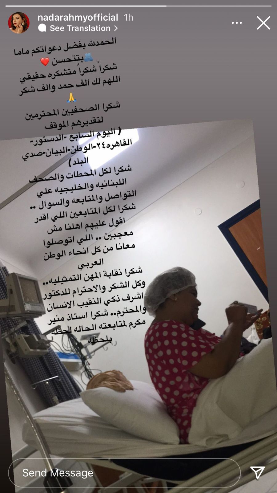 وعبرت عن امتنانها لاهتمام نقابة المهن التمثيلية بوالدتها، قائلة: «شكرا نقابة المهن التمثيلية، وكل الشكر والاحترام للدكتور أشرف زكي، النقيب الإنسان والمحترم، شكرا أستاذ منير مكرم لمتابعته الحالة لحظة بلحظة»