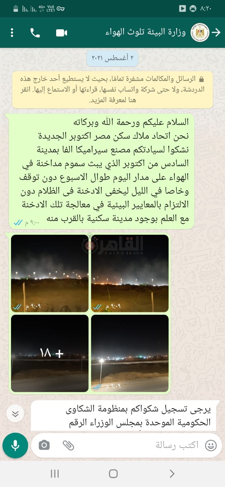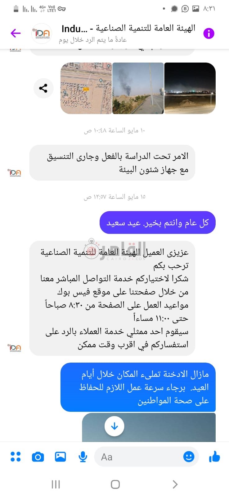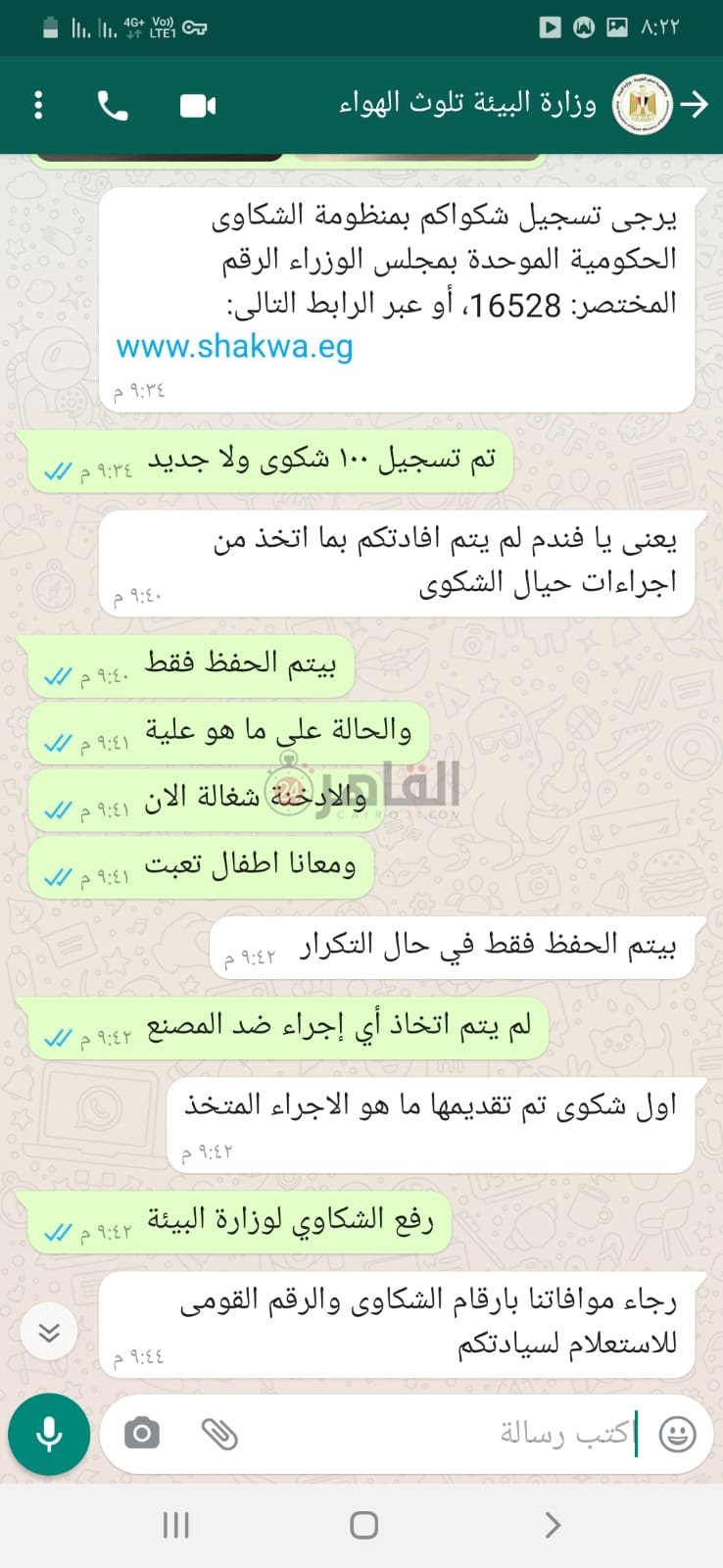 بالفعل سجل اتحاد الملاك شكواهم بمجلس الوزراء لكن لم يصلهم رد، حسب قول السيد تامر أحد قاطني المنطقة، الذي أكد أنه تم تقديم شكاوى كثيرة، ثم راسلوا الهيئة العامة للتنمية الصناعية؛ لاتخاذ إجراء ضد المصنع الذي يتضرر منه المواطنون.