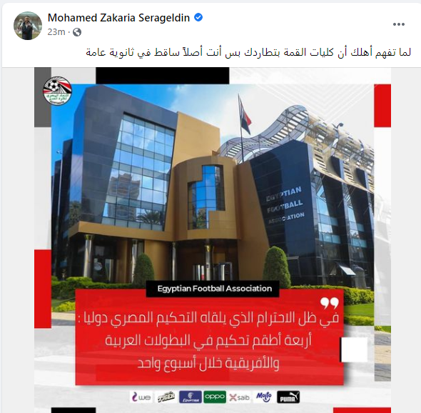 ومن جانبه، سخر محمد سراج الدين، عضو مجلس إدارة النادي الأهلي على بيان اتحاد الكرة، حيث نشر صورة البيان على صفحته الشخصية بموقع التواصل الاجتماعي وكتب: «لما تفهم أهلك أن كليات القمة بتطاردك.. بس أنت أصلًا ساقط في ثانوية عامة».