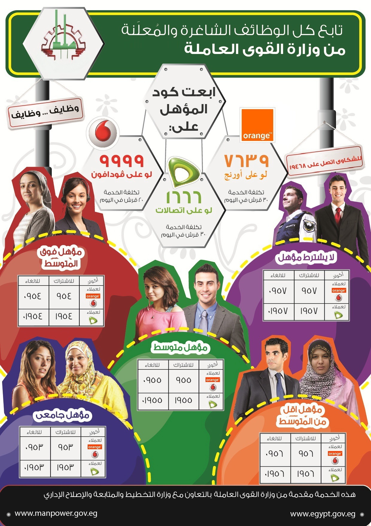 والوظائف التي لا تشترط مؤهلًا يتم الاشتراك بها عبر إرسال كود 957 وكود 0957 للإلغاء، بينما عملاء اتصالات بكود 1957 للاشتراك وكود 01957 للإلغاء.