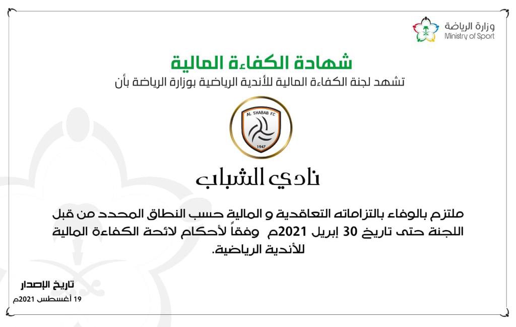 وأعلن نادي الشباب عن حصوله على شهادة الكفاءة المالية عبر حسابه الرسمي بموقع التواصل الاجتماعي تويتر، وذلك نظير التزامه المالي والتعاقدي حتى تاريخ 30 أبريل، وبذلك يحق له التسجيل في الفترة الصيفية الحالية.