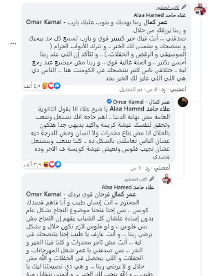 من جانبه رد عمر كمال على تعليق الداعية موضحًا مقصده من المنشور الذي كتبه وعرضه للهجوم إذ كتب: يا شيخ علاء أنا بقول الثانوية العامة مش نهاية الدنيا.. أهم حاجة إنك تشتغل وتتعب وتحقق لنفسك عيشة كريمة وأكيد بديهى جدا هتكون بالحلال أنا مش بتاع مخدرات ولا إنسان وحش للدرجة ديه عشان الناس تعاملنى بالشكل ده.. كلنا بنتعب وبنشتغل عشان نجيب فلوس ونعيش عيشة كويسة في الآخر وده قصدي.