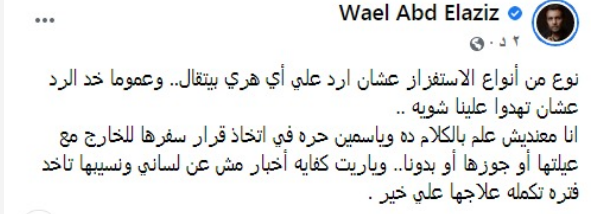 كتب وائل عبد العزيز عبر حسابه بموقع فيس بوك: «نوع من أنواع الاستفزاز عشان أرد علي أي هري بيتقال.. وعموما خد الرد عشان تهدوا علينا شوية».