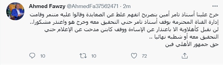 وقال فوزي عبر تويتر: خرج علينا أستاذ تامر أمين بتصريح اتفهم غلط عن الصعايدة، وقالوا عليه متنمر، وقامت إدارة القناة المحترمة بوقف أستاذ تامر حتى التحقيق معه، وخرج هو واعتذر مشكورا.