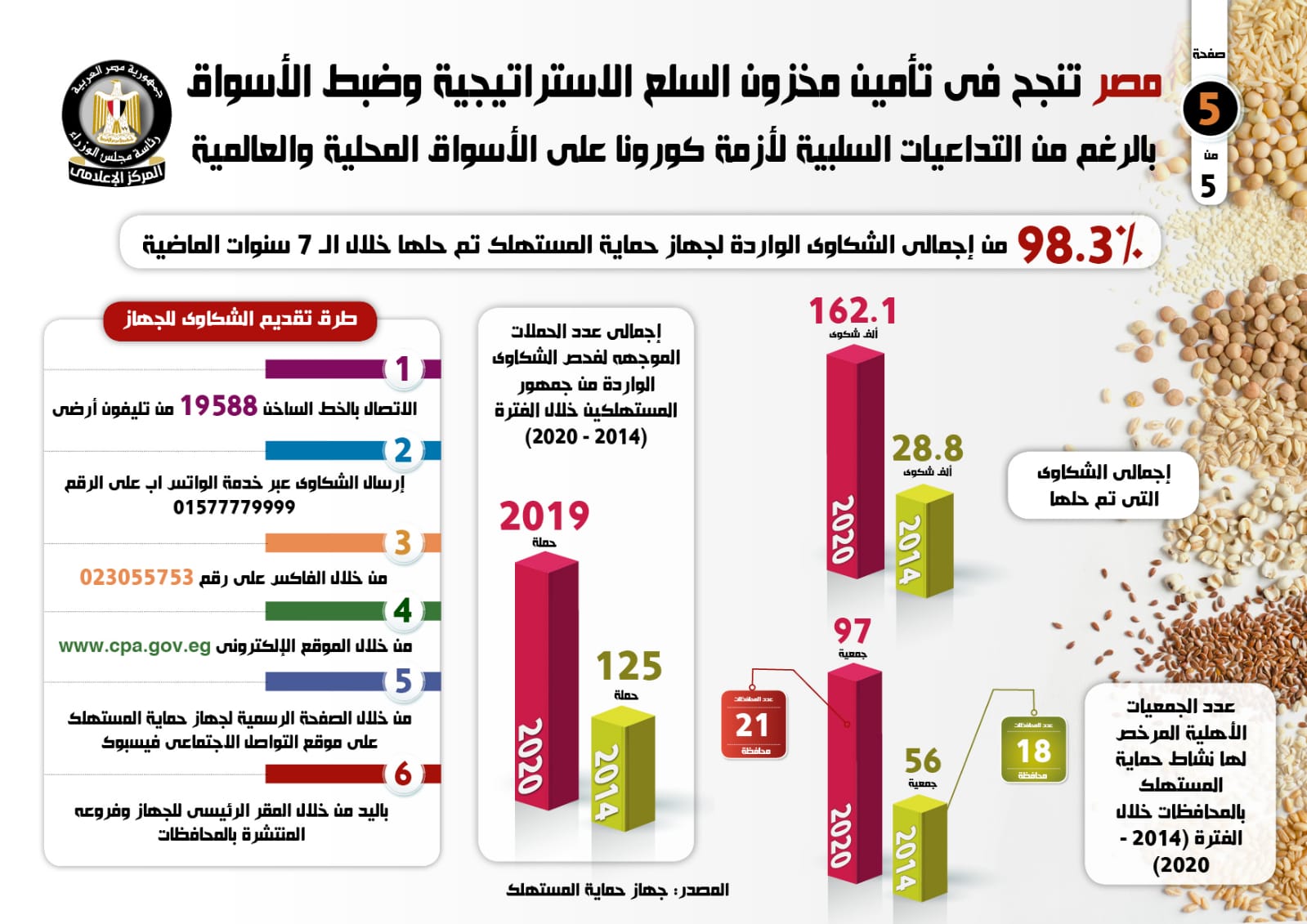 في هذا السياق، نشر المركز الإعلامي لمجلس الوزراء تقريرًا تضمن إنفوجرافات تسلط الضوء على نجاح مصر في تأمين مخزون السلع الاستراتيجية وضبط الأسواق، رغم التداعيات السلبية لأزمة كورونا على الأسواق المحلية والعالمية.